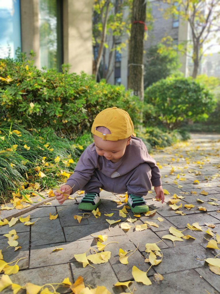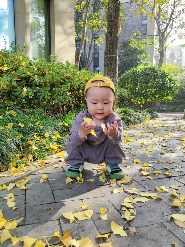 银兴的叶子金黄金黄的铺了一地,真好看。别看我手小,我可以一手抓一把哦。💪