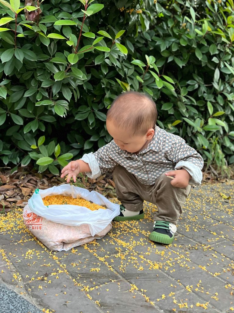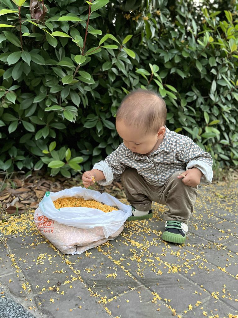 傍晚的时候妈妈和姥姥带我出来采桂花,妈妈说姥姥今天烙的桂花饼很好吃。我在她们跟前走来走去,有时候还可以帮妈妈把桂花里的叶子挑出来呢。我是不是特别能干呢。😘