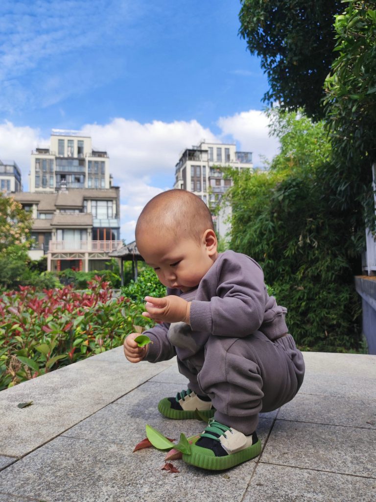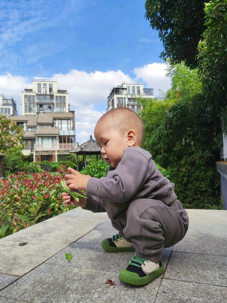 爸爸给我捡了一些树叶,我要把它们一片一片的叠起来。哎呀,怎么都散到地下了。我生气的时候可是会把你们都扔掉的噢。