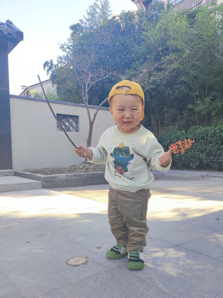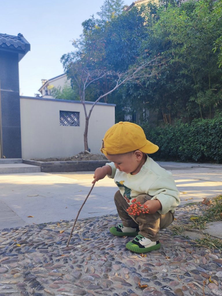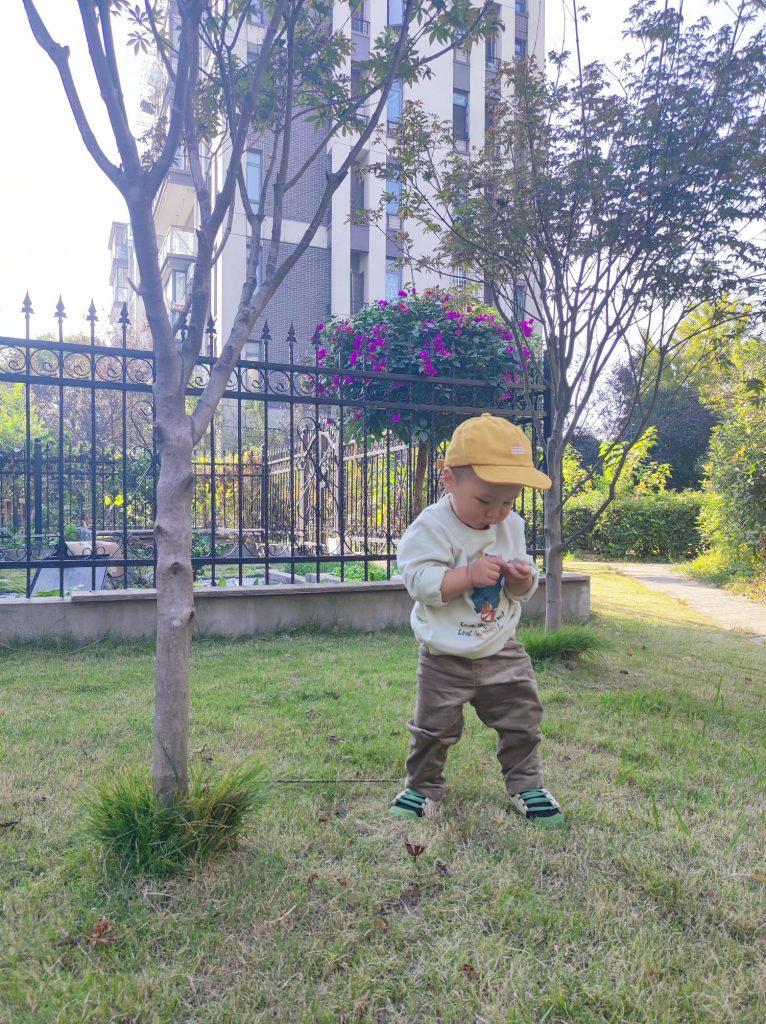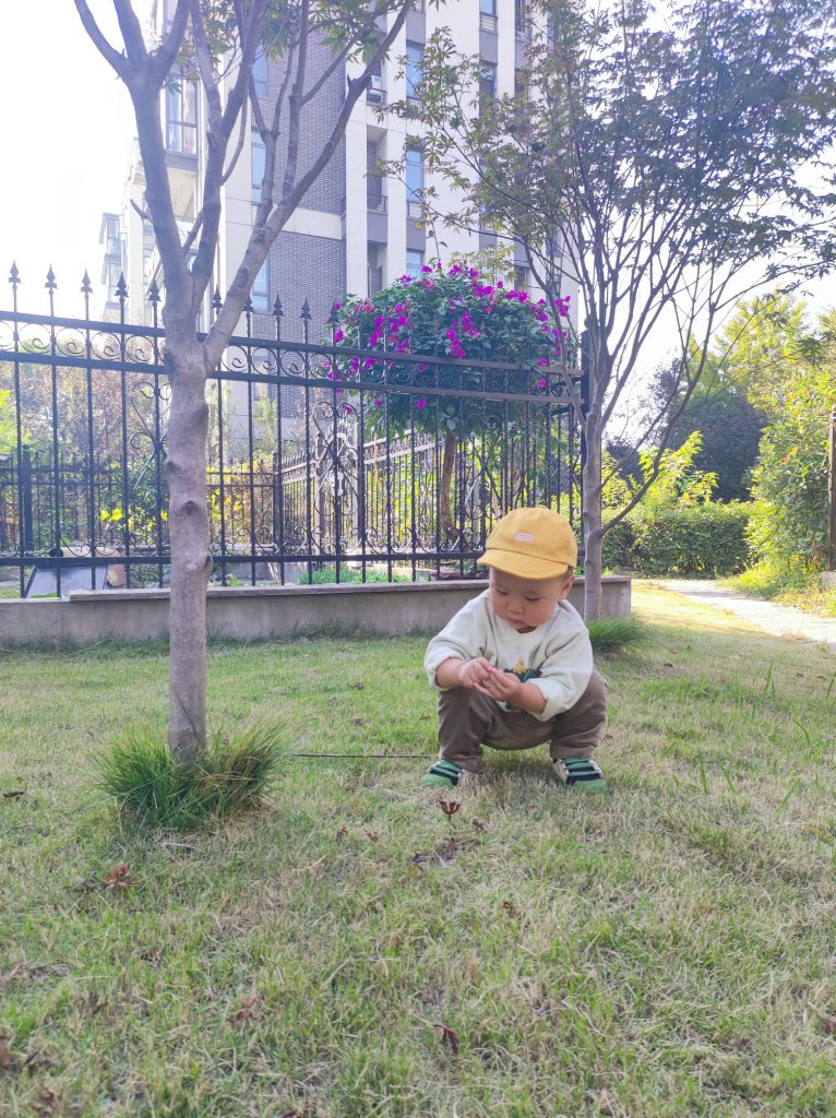 爸爸给我抱回家我就醒了,而且喝完奶粉就不睡了。没办法,他只能带我再出去耗电去了。我们两个探索了1/4个小区,敲了石头,摘了毛毛草,捡了叶子和石头。幸好爸爸精力比较好。😃