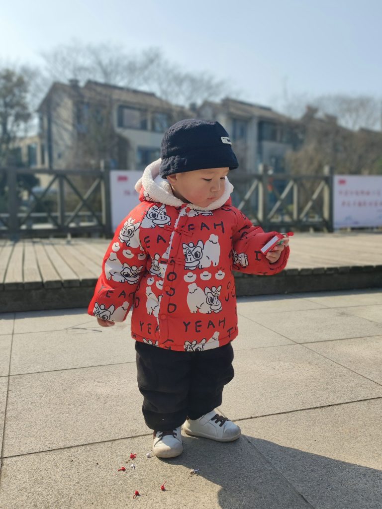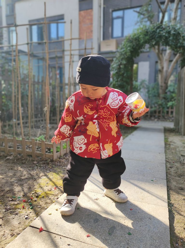 今天初五,爷爷奶奶很早起来就扫扫扫的,我也跟爷爷和爸爸一起在院子里放鞭炮,迎财神。保佑爸爸妈妈今年赚很多的钱。😜
