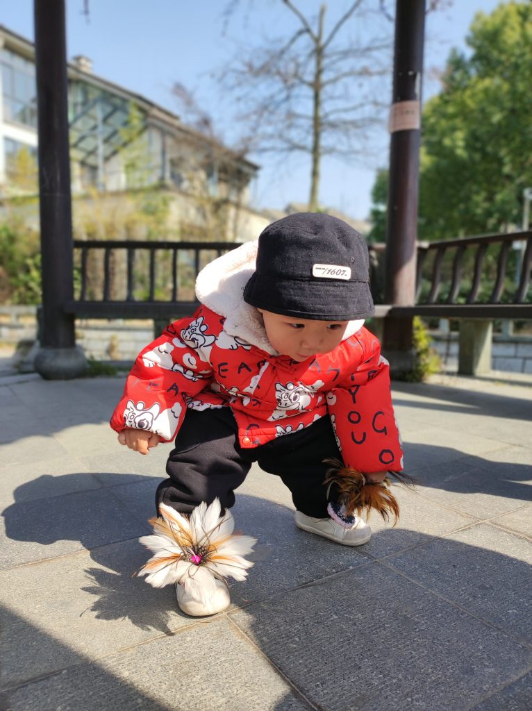 阿姨踢毽子,我也要模仿这学,先把毽子放到脚脚上,然后踢一下。看我的姿势可以吗,是不是学东西特别快😃